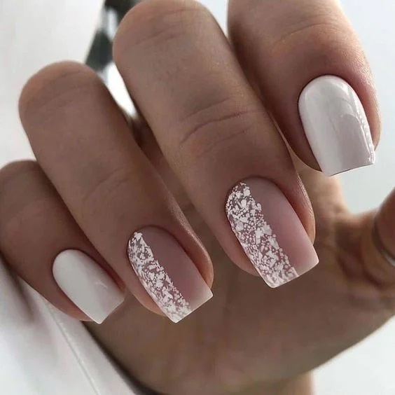 Поєднання білого кольору з бежевою гамою кольорів гармонійно виглядає в манікюрі.