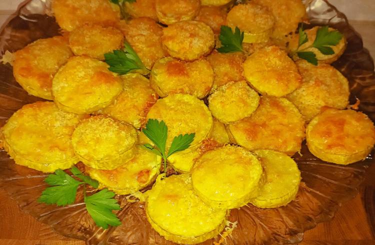 На кожен кружок кабачка поміщаю суміш сиру і сухарів у вигляді кришечки. Повертаю лист у духовку на 3-5 хвилин. Сир із сухарями за цей час повинен перетворитися на гарну шапочку поверх кабачкового кільця. Перекладаю кабачки на блюдо, посипаю зеленню та подаю.
