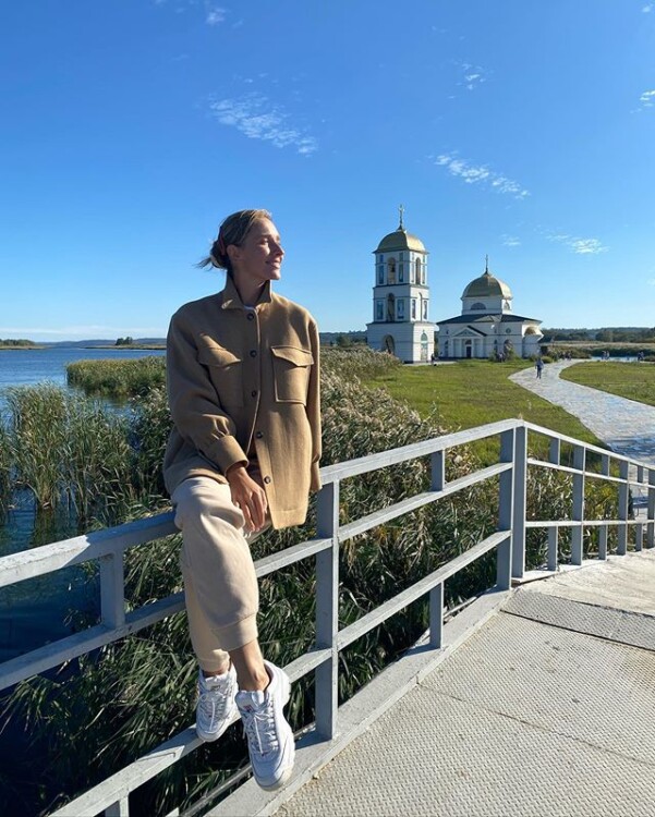 Катя та Юрій не могли пройти повз церкви та не сфотографуватися. Знімки вийшли чарівними, підписники вже встигли оцінити живописні види. Телеведуча вирішила, що для прогулянки їй підходить комфортний та стильний одяг в дуже популярних пастельних відтінках. Вона позує на фото в пальто-сорочці, брюках спортивного типу та величезних білосніжних кросівках.
