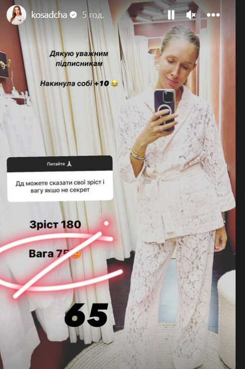 Відома українська телеведуча Катерина Осадча у сторіс свого інстаграму вирішила відповісти на запитання своїх фоловерів. Підписникам стало цікаво, який зріст має їхня улюблена телезірка, та яка у неї зараз вага.