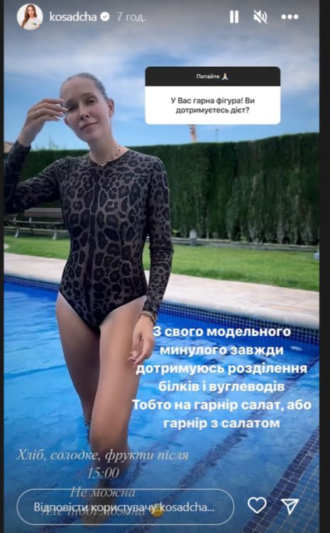 “Зі свого модельного минулого завжди дотримуюся розділення білків та вуглеводів. Тобто на гарнір салат або гарнір із салатом. Хліб, солодке та фрукти після 15.00 не можна. Але іноді можна” – підсумувала телеведуча.