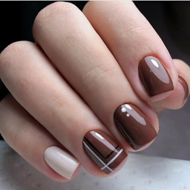 Кавовий відтінок коричневого кольору вважається універсальним рішенням як в гардеробі, так і манікюрі. Темні коричневі кольори середньої насиченості, в тому числі і кави з молоком, чудово виглядають на жіночих нігтях. Найбільш часто ця палітра використовується безпосередньо в холодний сезон, коли леді починають обирати більш глибокі і насичені тони.