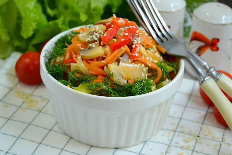Корейський салат з грибами – це відмінний варіант ароматної, трохи гоструватої закуски і для буднів, і для святкового столу. Приготувати такий салат можна заздалегідь про запас і зберігати в холодильнику кілька днів перед подачею. Він стане тільки смачнішим і набуде більш насиченого смаку і аромату.