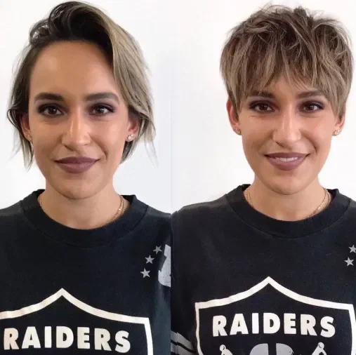 Стрижка піксі з рваним чубчиком – чудовий варіант для тонкого волосся, багатошаровий чубчик додасть об’єму і текстури волоссю. А ще вона класно підкреслює овал обличчя та візуально робить його чіткішим.