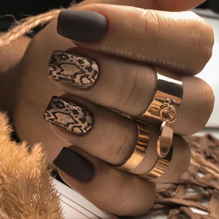 Тваринний принт все ще на піку популярності. Однак, якщо леопард дещо набрид суспільству, того ж не можна сказати про зміїний і візерунки зебри. Причому перший максимально гармонійно виглядатиме у парі з коричневим кольором покриття на нігтях.