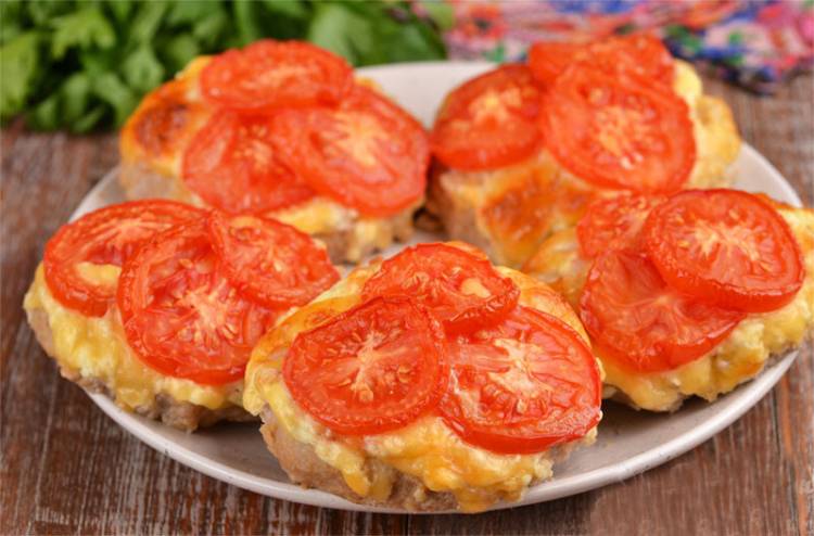 Щоб зробити страву красивою (яскравою), помідори невеликого діаметру нарізаємо кружальцями і по 3 кружечки розміщуємо на сирі. Відправляємо в розігріту духовку за 180 градусів на 35-40 хвилин.