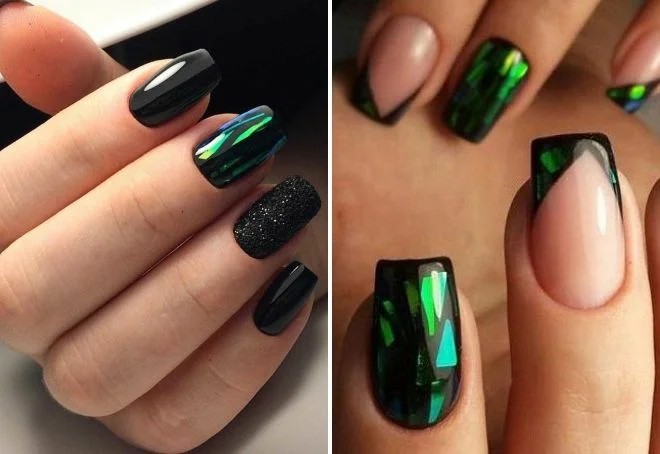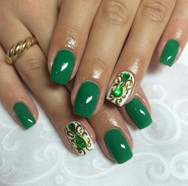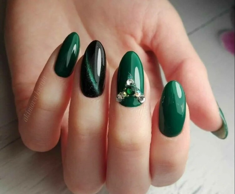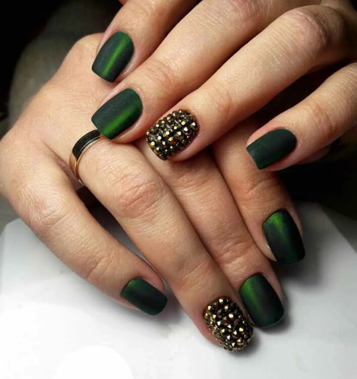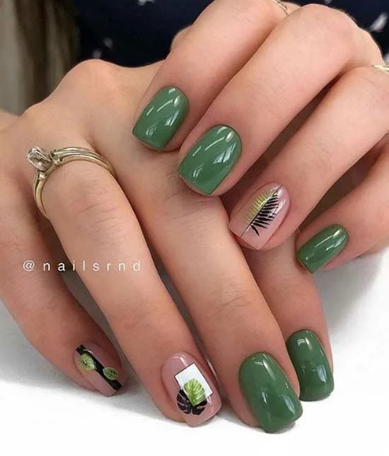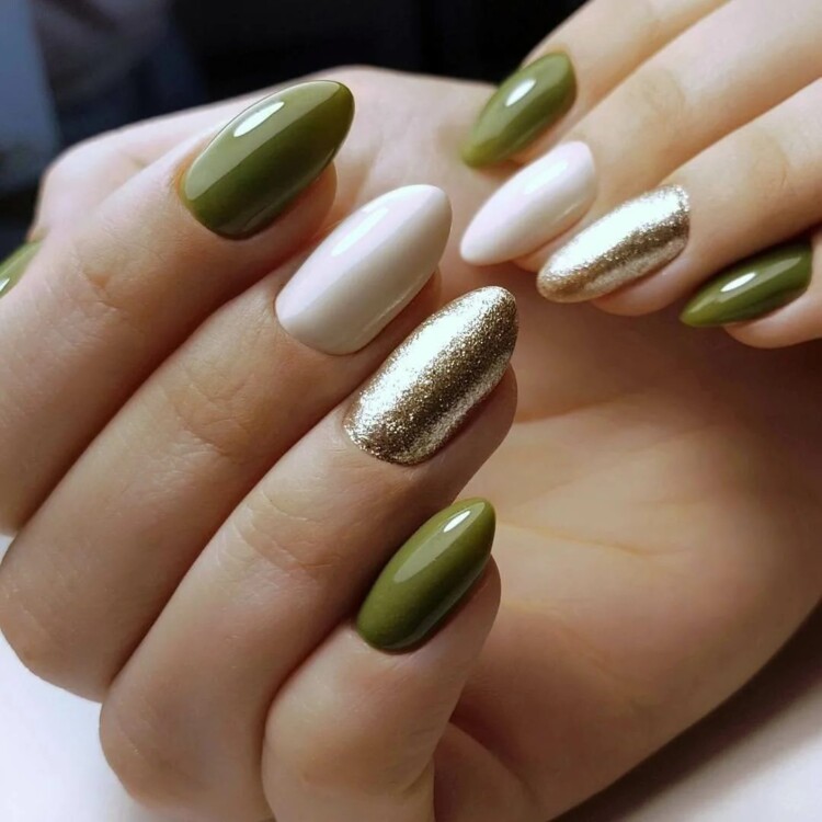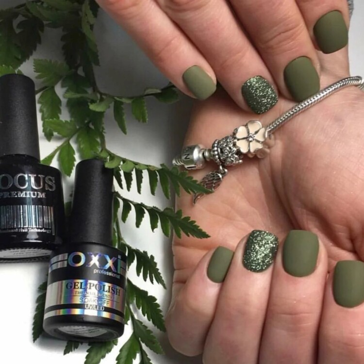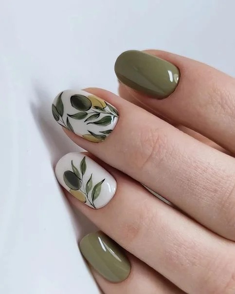 Зелений колір — безумовно тренд цього сезону, але якщо тебе бентежить надмірна яскравість і помітність, то можна вибрати більш спокійні відтінки. Наприклад, оливковий. А розбавити такий манікюр можна жовтими, блакитними або помаранчевими відтінком.