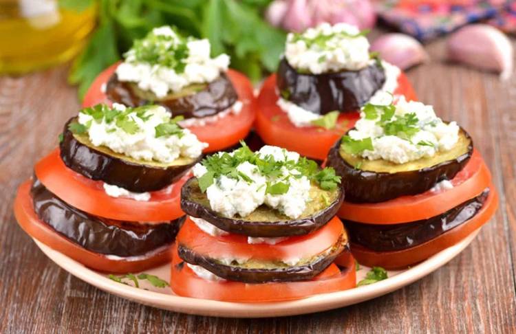 Зверху на баклажани викладаємо кружечки помідорів, потім сирна суміш, кружечки баклажана, що залишилися, і залишки сирної суміші. Закуска готова.