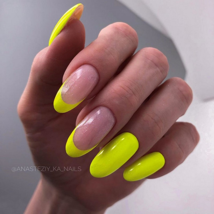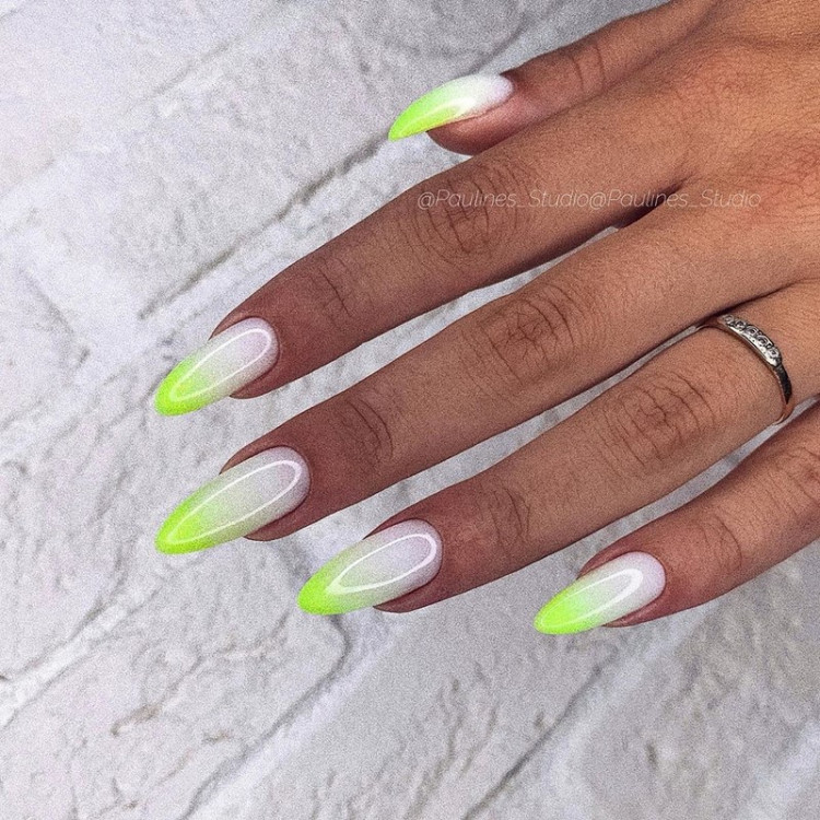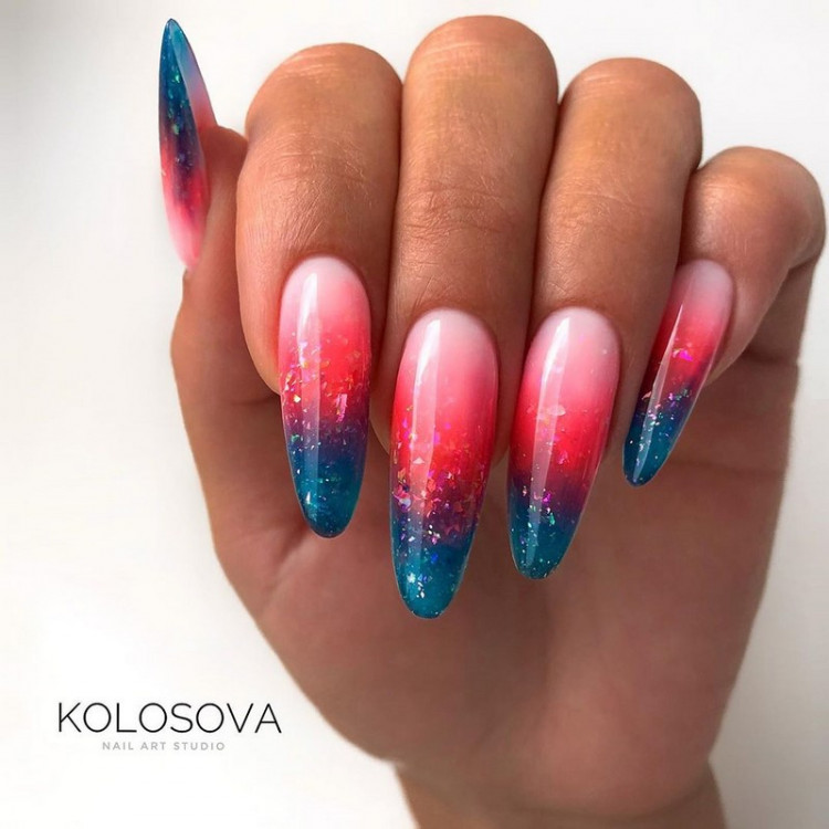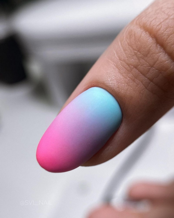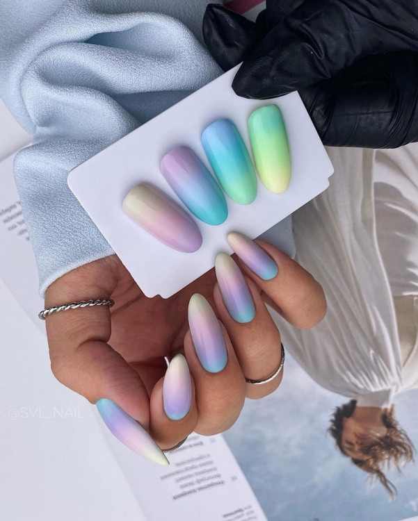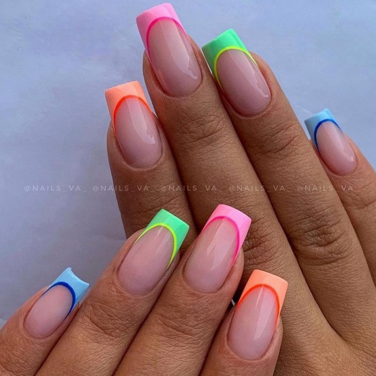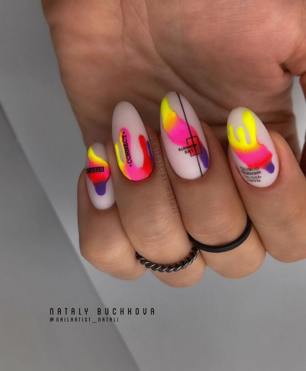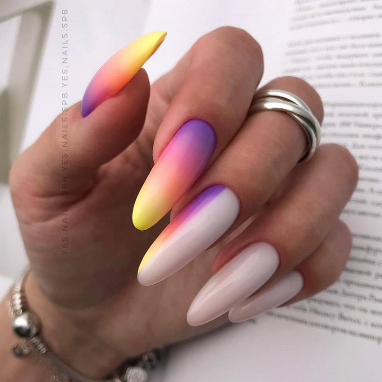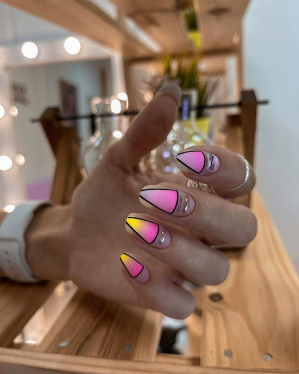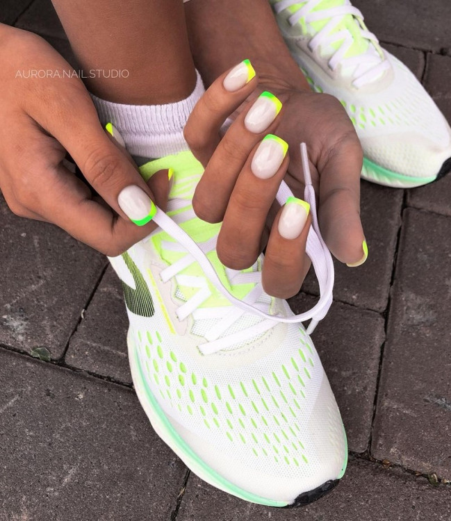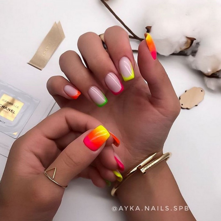 Плавний перехід яскравих неонових відтінків у манікюрі весна-літо 2022 дуже ефектно виглядає на засмаглих пальчиках. З’єднання двох або трьох кольорів завжди буде підходити для легких образів з кросівками або босоніжками на низькій підошві.