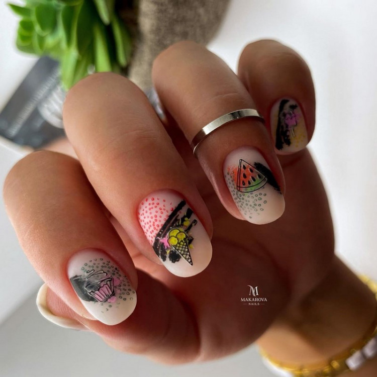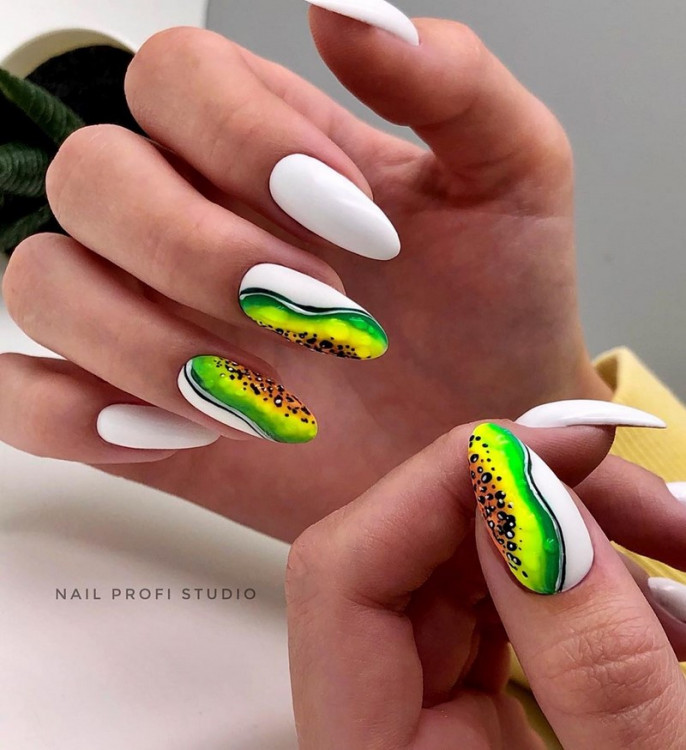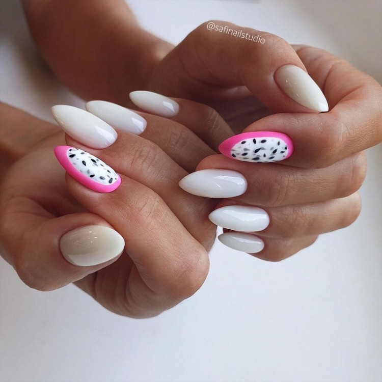 З настанням весни та літа в наших регіонах настає пора свіжих натуральних фруктів, тому багатьох представниць прекрасної статі тягне на ніжний, соковитий фруктовий манікюр. Він додасть вашому образу свіжості та шикарно доповнить гарні луки. Варіанти фруктів, які найчастіше зображають у манікюрі: