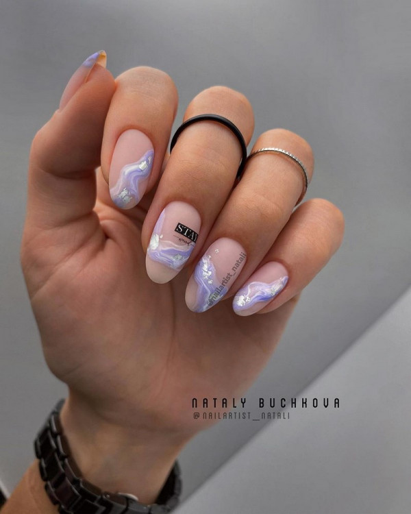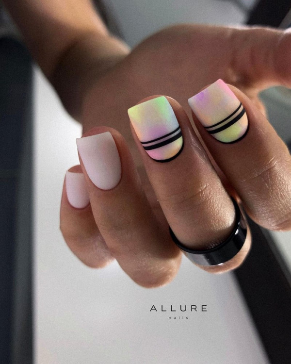 Половинчастий манікюр виглядає дуже цікаво у весняно-літньому варіанті. Смужку, яка розділяє два кольори можна прикрасити фольгою, золотою смужкою, стрічкою, ніжним візерунком. Поділ може бути вертикальним чи горизонтальним.