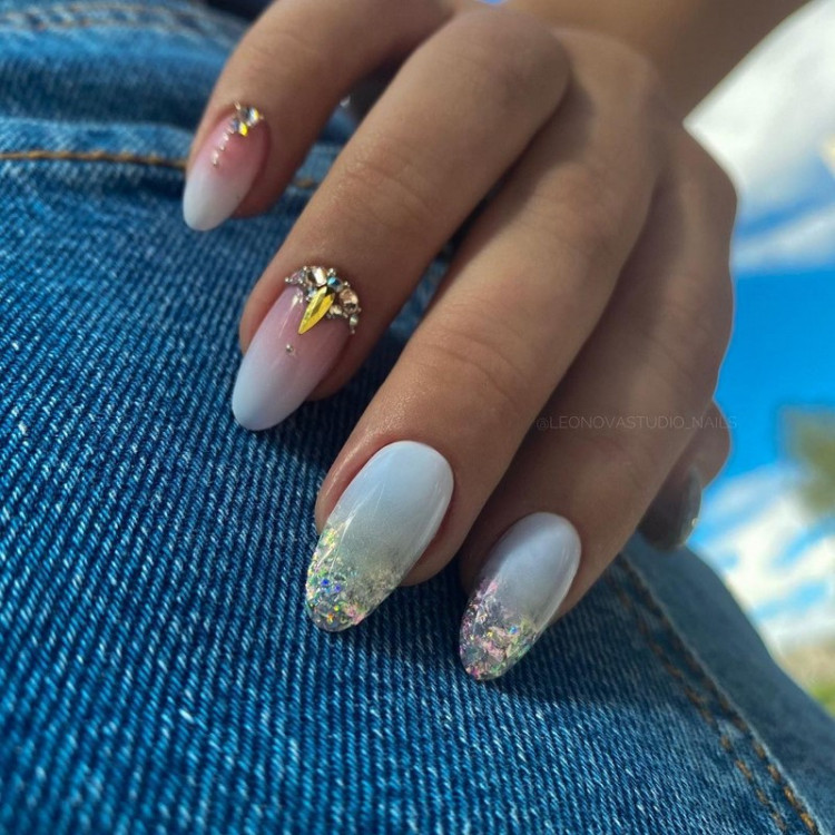 Білосніжний манікюр чудово поєднується з яскравим літом. Він виглядає дуже витончено, ніжно та універсально, що дозволяє поєднувати його з різними образами. Доповнивши його золотою фольгою, блискітками або стразами ви створите манікюр, який виглядає дуже ефектно і чудово сяє на сонечку.