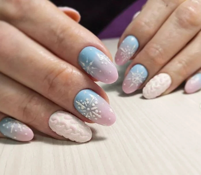 В’язаний манікюр представлений у вигляді візерунка, який часто присутній на теплих светрах. Особливо актуальний такий дизайн в зимовий сезон. В’язані візерунки можна зробити у вигляді акценту на одному або двох пальчиках. Додатково манікюр прикрашають блискучим глітером, який дозволить закінчити стильний дизайн на круглій формі нігтів.