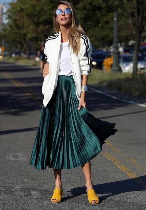 Добре будуть працювати контрасти текстур, різнорідність матеріалів, і, звичайно ж, контрасти силуетів. Що може бути романтичніше і жіночніше, ніж спідниця в складку? Тому поєднання плісированих спідниць з бомбером – свідомо безпрограшна. Однак не варто забувати, що в полярних комбінаціях з яскраво вираженим стилем головне завдання – створити баланс між закритими і відкритими ділянками тіла. Тому не рекомендується в одному образі використовувати і глибоке декольте, і довгі розрізи або дуже коротку спідницю.