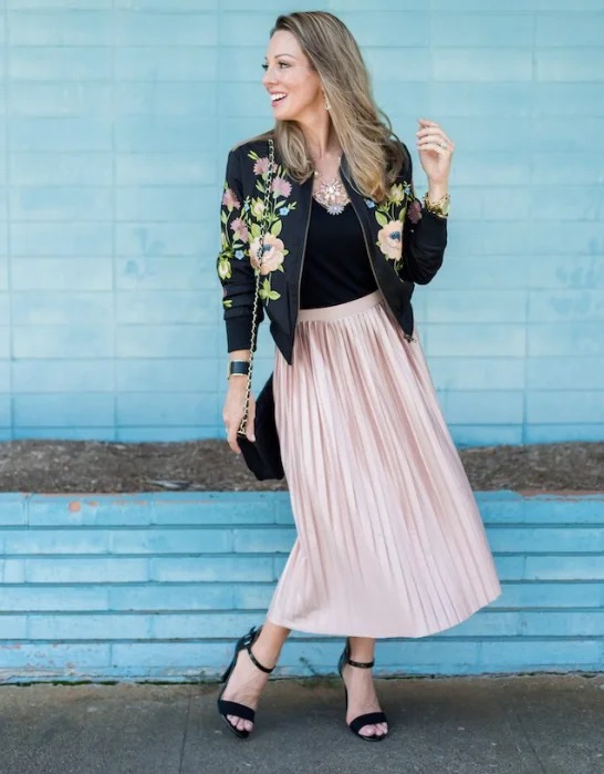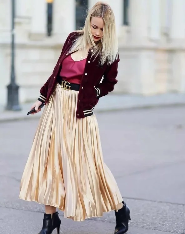 Більш стриманий варіант, розрахований на вікову аудиторію, представлений бомбером і спідницею-міді. Доповнити образ можна рюкзаком або компактною сумкою, масивними прикрасами в стилі 90-х, окулярами з актуальною оправою – немає простішого варіанту для перетворення в зірку стріт стайл 🙂
