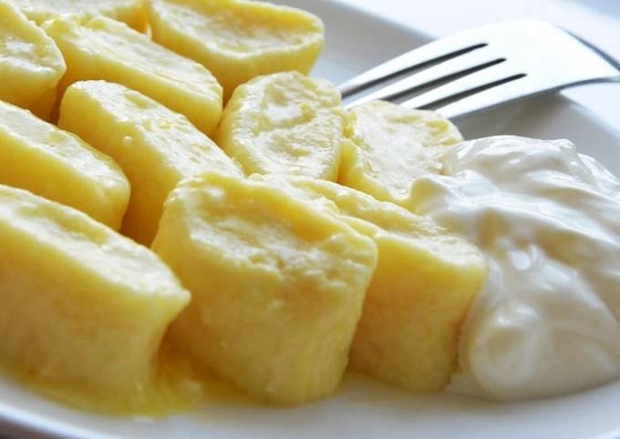 М’який сир, цукор, сіль, яйце розтираємо за допомогою виделки, потім додаємо просіяне борошно і замішуємо тісто. Стіл присипаємо борошном, перекладаємо тісто на стіл, трохи вмішуємо борошно і поділимо тісто на дві частини. Розкочуємо тонкий жгут і нарізаємо на невеликі шматочки. Після закипання води, відправляємо вареники у воду і після того, як вони спливуть, варимо ще 2-3 хвилини.