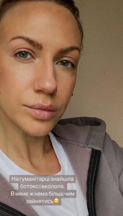 Леся поділилася фотознімком свого обличчя, на якому добре видно губи і у своєму фірмовому саркастичному стилі зазначила, що укол ботоксу знайшла у гуманітарній допомозі, яку збирає для українців, які тікають від війни.