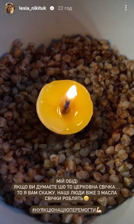 “Мій обід. Якщо ви думаєте, що то церковна свічка, я вам скажу, що наші люди вже і з масла свічки роблять, – написала вона. – Ну як цю націю перемогти?!”