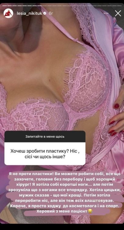 “Я нічого не маю проти пластичних операцій. Головне – робити це розумно і за допомогою кваліфікованих лікарів. Хоча колись думала про корекцію ніг, але зрозуміла, що це зайва справа. Те ж саме стосується і грудей, а також носа. Просто стежу за своїм здоров’ям та виглядом”, – зазначила вона.