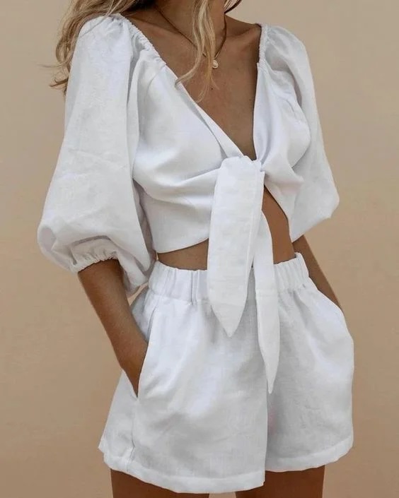 Світлий бавовняний топ з бантом на талії + білі трендові шорти – ідеальний образ для спекотної погоди.