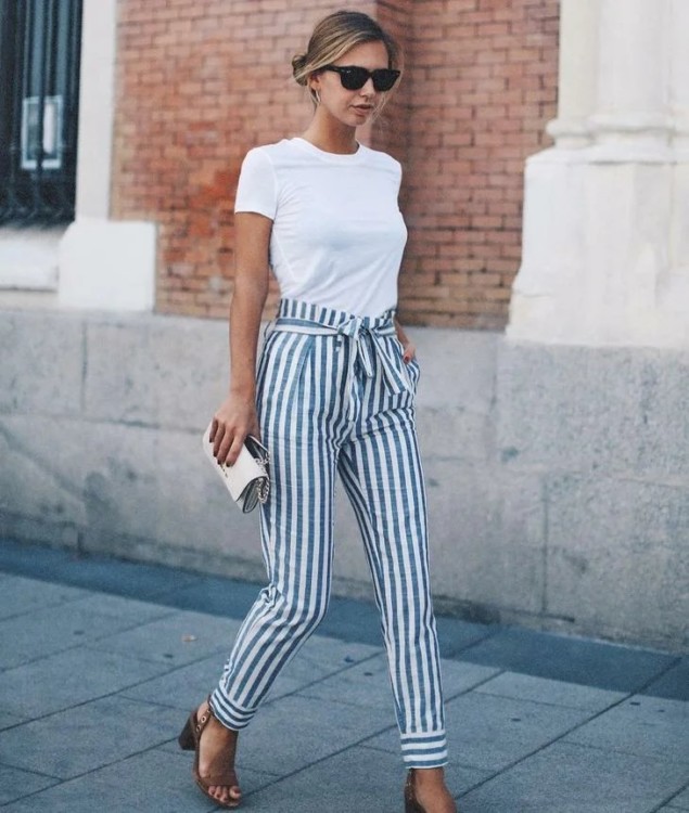 Літні бавовняні або лляні штани можна поєднувати з футболками і топами. Цей образ підійде для спекотної погоди.