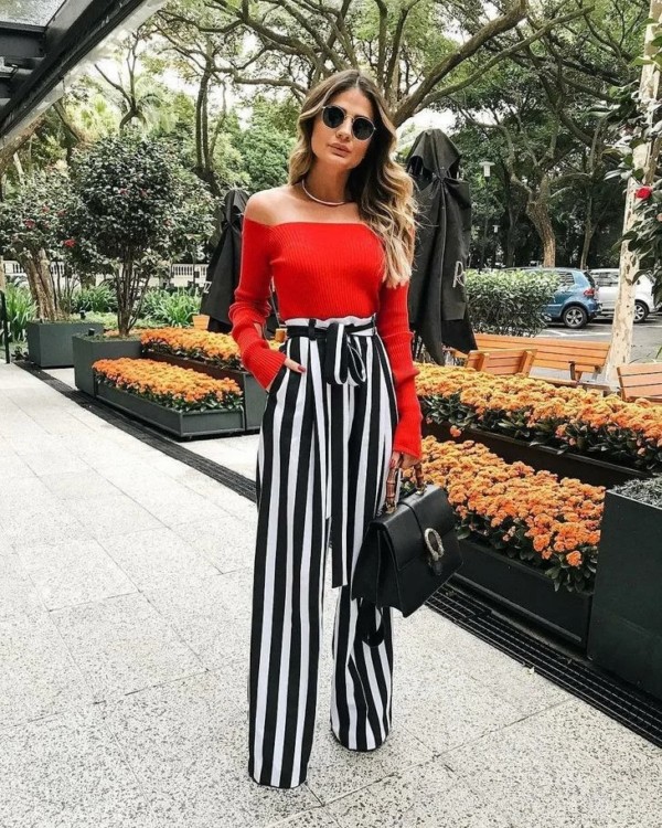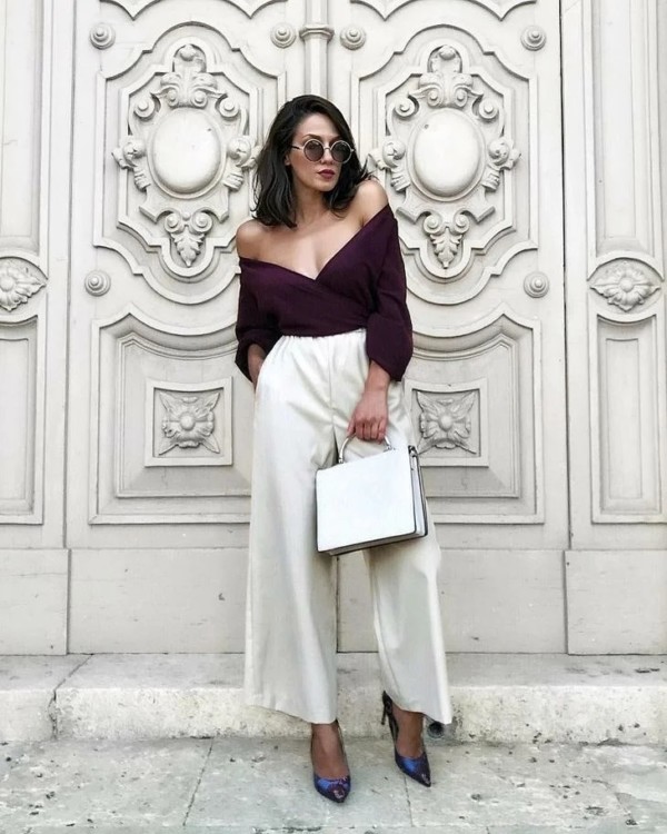 Широкі вільні брюки палаццо, виконані з шифону, поєднуйте з взуттям на підборах. А щоб не погіршити образ, надягайте облягаючий верх – топи, блузи, безрукавки.