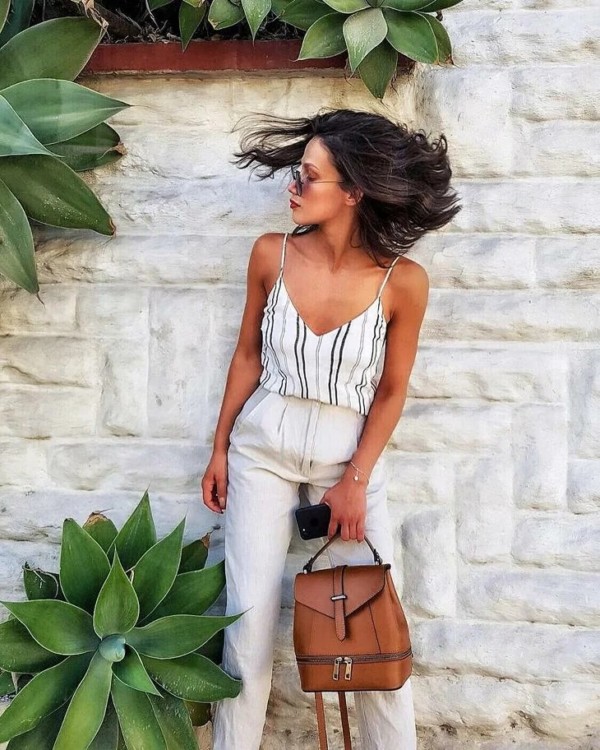 Літні бавовняні або лляні штани можна поєднувати з футболками і топами. Цей образ підійде для спекотної погоди.