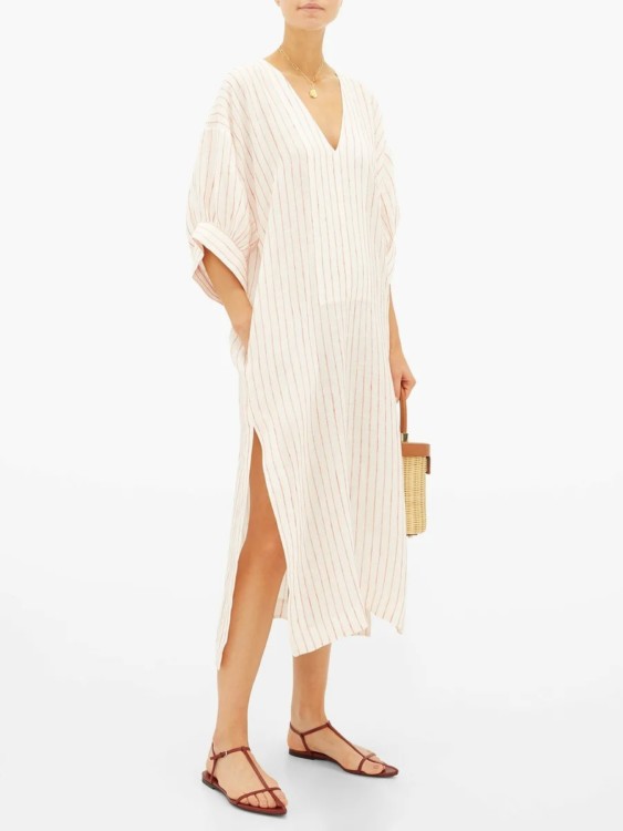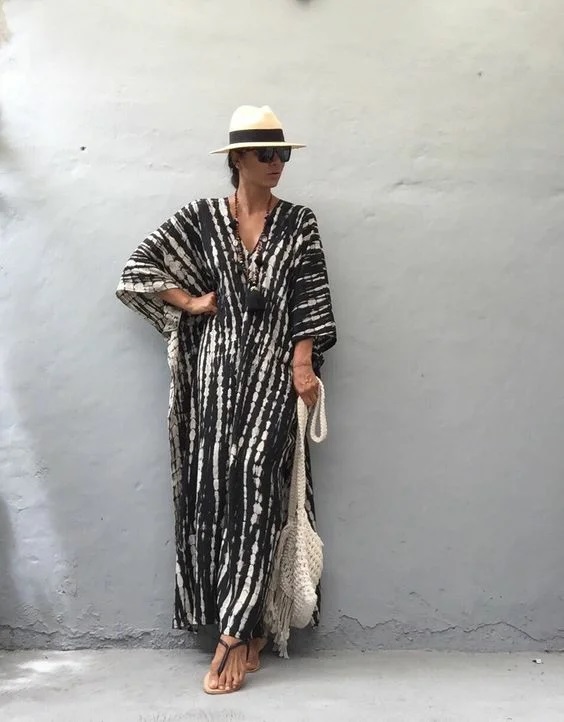 Туніку в біло-блакитну вертикальну смужку можна використовувати для створення стильних пляжних аутфітов. Завдяки своєму універсальному крою з даною моделлю туніки можна носити, як взуття на плоскому ходу, так і босоніжки на високих підборах.