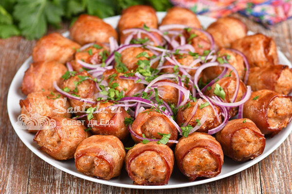 Для приготування потрібно 14 смужок сирого або копченого бекону (у мене копчений). Розрізаємо бекон навпіл. Кульки з фаршу змащуємо підготовленим соусом, загортаємо в скибочки бекону, закріплюємо зубочистками і зверху знову змащуємо соусом. Соус дає не тільки відмінний смак, але і колір.