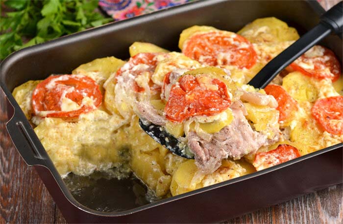 Закриваємо м’ясо залишками картоплі (1/3 частина), солимо та перчимо. Додаємо зверху кружечки помідорів, змащуємо майонезом (2 ст. л.). Майонез можна замінити сметану. Закриваємо форму фольгою, запікаємо в духовці при 180 градусах 50 хвилин і ще 20 хвилин без фольги.