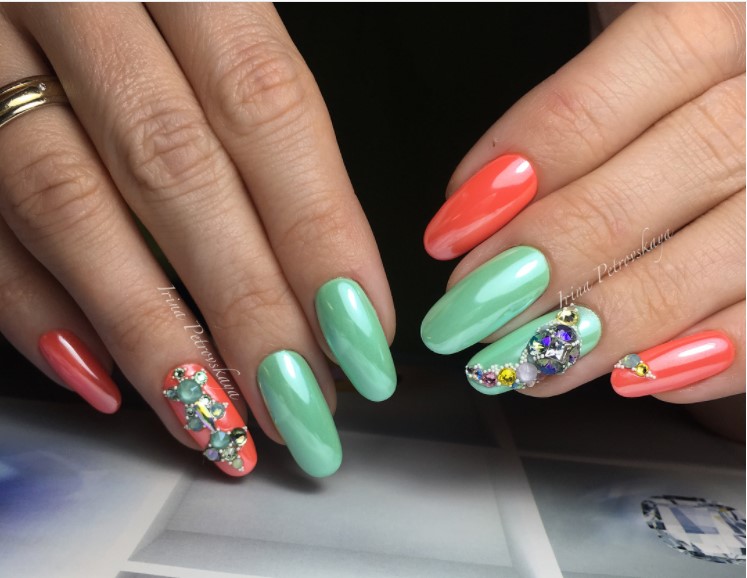 Кораловий колір виглядає дуже ніжно і вишукано. До того ж, в 2020 році він знаходиться на піку популярності. Саме тому ми радимо вам придивитися до цього кольору, якщо ви бажаєте створити інтересний і унікальний дизайн. Прекрасно кораловий буде працювати і в парі з м’ятним покриттям. При цьому ви тут можете сміливо експериментувати і додавати в м’ятно-кораловий манікюр малюнки та візерунки, різноманітні принти, цікаві техніки і декор.