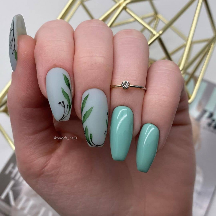 М’ятний манікюр прекрасно буде працювати в парі з такими візерунками, як квіткові. Адже ніжний відтінок просто створений для того, щоб створити весняний або літній нейл-арт, а значить тематичні малюнки просто ідеальний вибір для подібного дизайну. Спеціаліст нейл-арту може зобразити візерунок на нігтиках, самостійно вималювати його, або ж звернутися до популярної техніці стемпінга. Стемпінг – це ідеальний вибір для новачків. Адже останнім часом з’явилася чимала кількість трафаретів, з самими різними візерунками, які ідеально можуть перекочувати на ваш м’ятний манікюр.