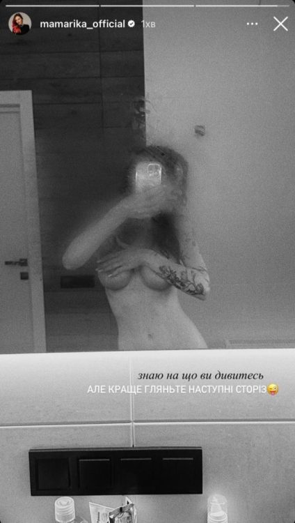 У своїх Instagram-сторіс вона опублікувала відверте чорно-біле фото. На знімку співачка стоїть перед дзеркалом у ванній кімнаті. Вона зображена топлес, а викладачка приховала непристойні частини тіла рукою.