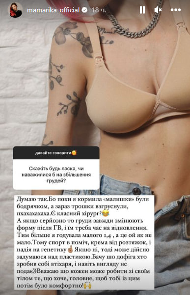 Українська співачка MamaRika 14 березня, відповідаючи на запитання підписників в Instagram Stories, зізналася, що могла б зважитися на операцію зі збільшення грудей.