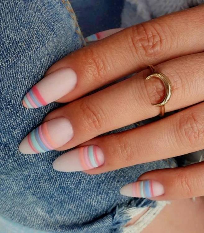 Любителькам спокійної кольорової гами, що віддають перевагу довгим нігтям овальної форми, варто звернути увагу на оформлення у вигляді тонких різнокольорових ліній, завдяки яким манікюр виглядає більш оригінальним.