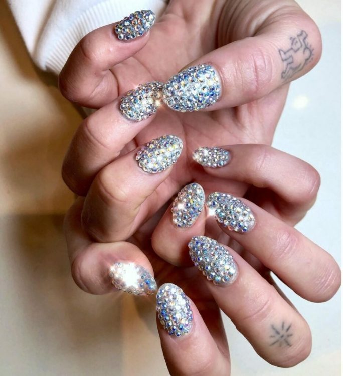 Хочеться ще більше блиску? Попросіть нейл майстра повністю викласти блискучими стразами нігтьову пластину. Можна не кожну, а, наприклад, лише два пальці на обох руках.
