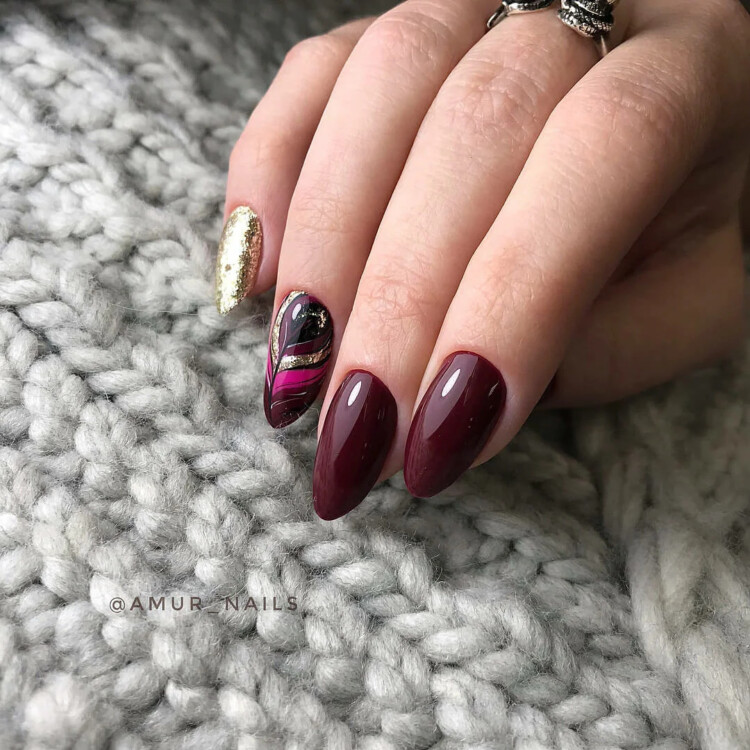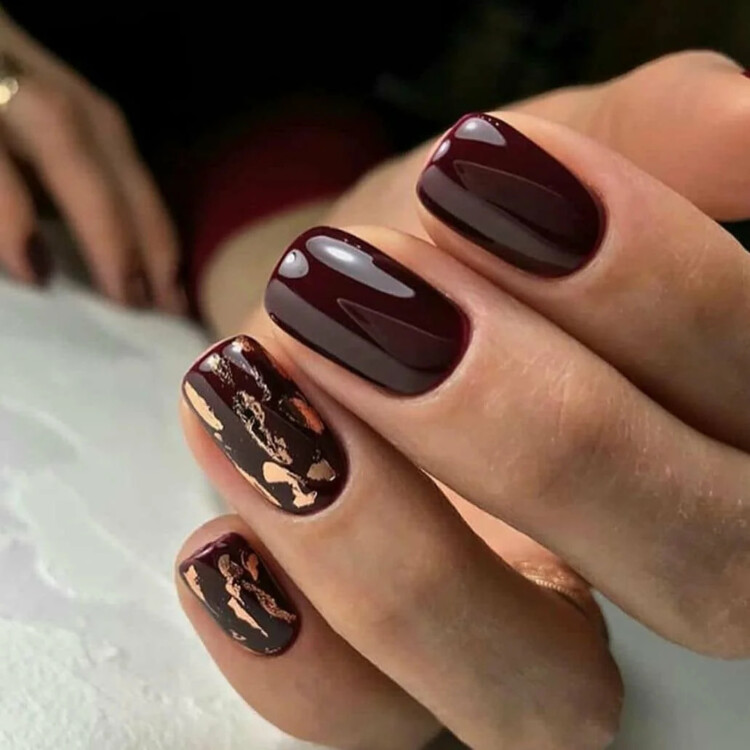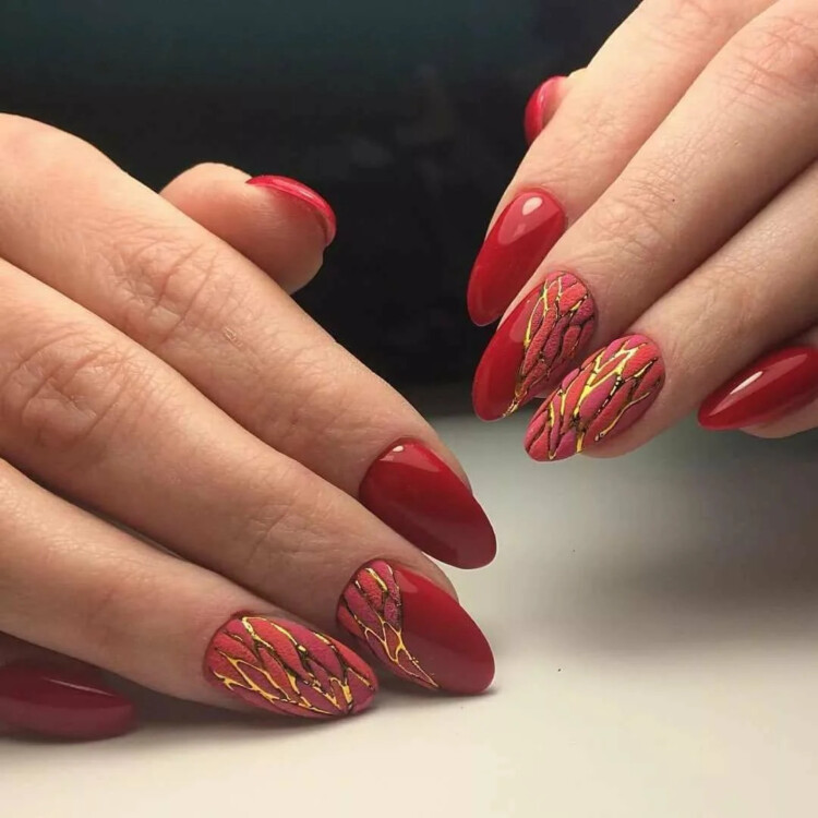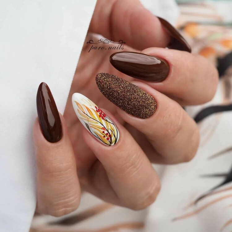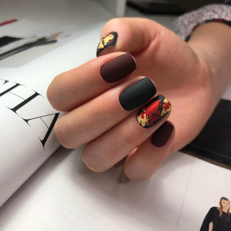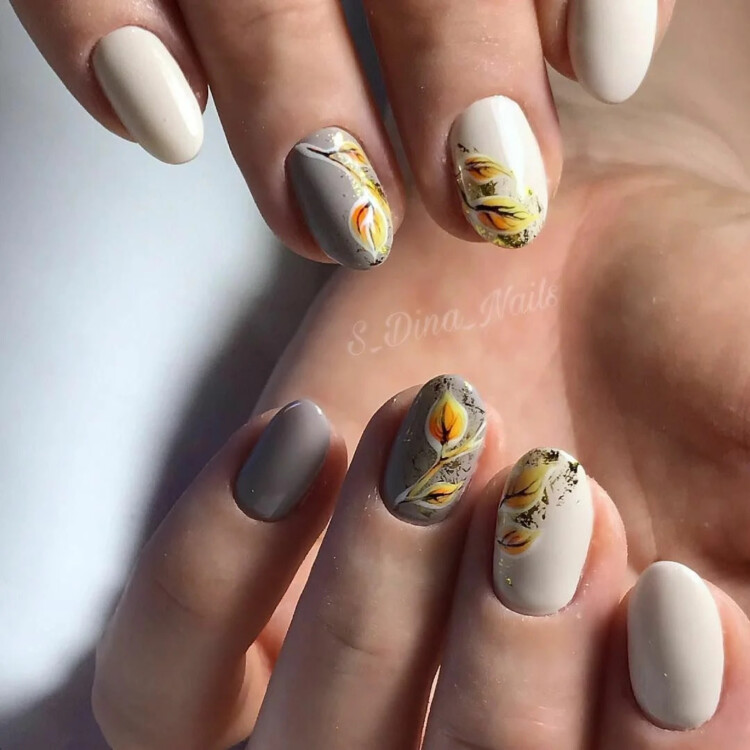 Красиво виглядають у вигляді декору натуральні текстури, вони ефектно виглядають на світлому або білому фоні. Можна вибрати втірку і зробити з неї пару нігтиків. Також восени популярний художній розпис. Золота фольга надає манікюру ефектність і неповторність.