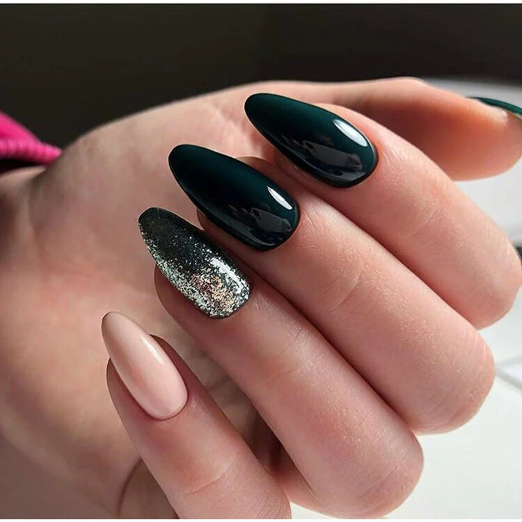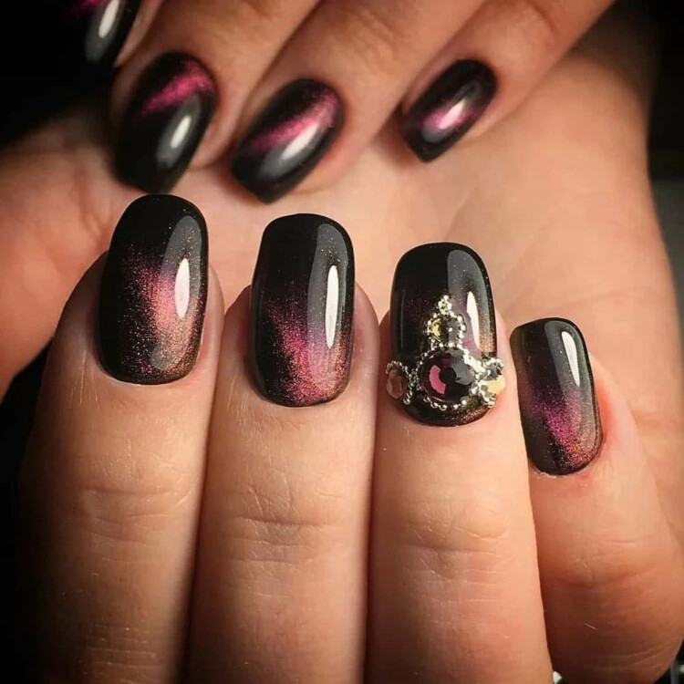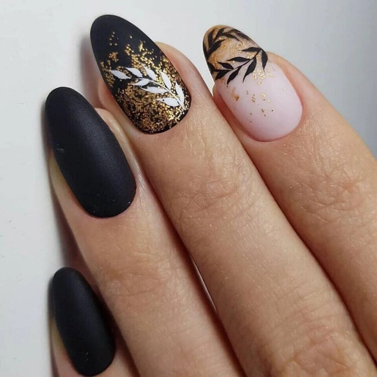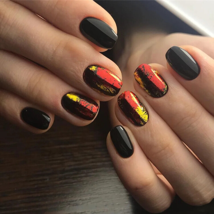 Красиво виглядає чорний манікюр в тандемі з іншим більш світлим відтінком. Тут можна додати золоті блискітки або пару страз. Мінімалізм прекрасно виглядає на будь-якому відтінку. Головне, визначитися з малюнком. Економлять час також наклейки. Можна підібрати абсолютно будь-які варіанти, які ідеально впишуться в ваш образ.