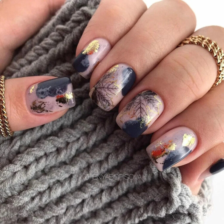 Красиво виглядають у вигляді декору натуральні текстури, вони ефектно виглядають на світлому або білому фоні. Можна вибрати втірку і зробити з неї пару нігтиків. Також восени популярний художній розпис. Золота фольга надає манікюру ефектність і неповторність.