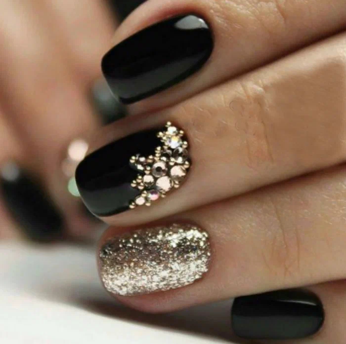 Чорний колір – це класика. Цей відтінок лаку відмінно виглядає на нігтях будь-якої довжини і форми і підходить до різних нарядів. Хочете, трохи урізноманітнити однотонний манікюр, додайте золотистих страз та блискіток.