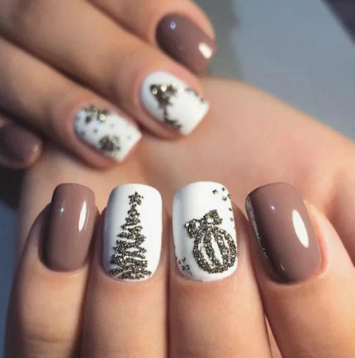 Ялинка та кульки – класичні атрибути зимових свят. Сміливо зображуйте їх на нігтях, якщо ви любите тематичні дизайни. Ну, а щоб манікюр не виглядав надто химерно і помітно, поєднуйте їх зі спокійними, неяскравими кольорами.