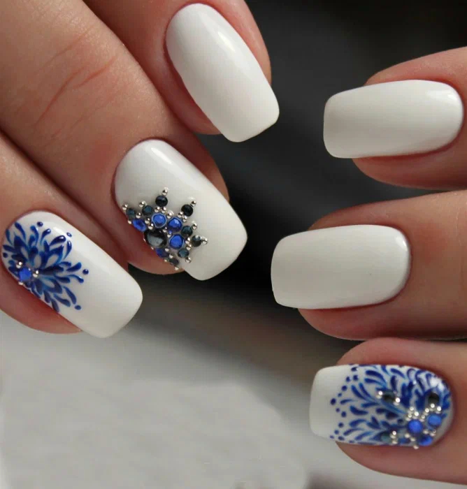 Ефектне біле покриття з яскравими синіми сніжинками, намальованими фарбами та викладеними зі страз – чудовий варіант для стильного зимового манікюру.