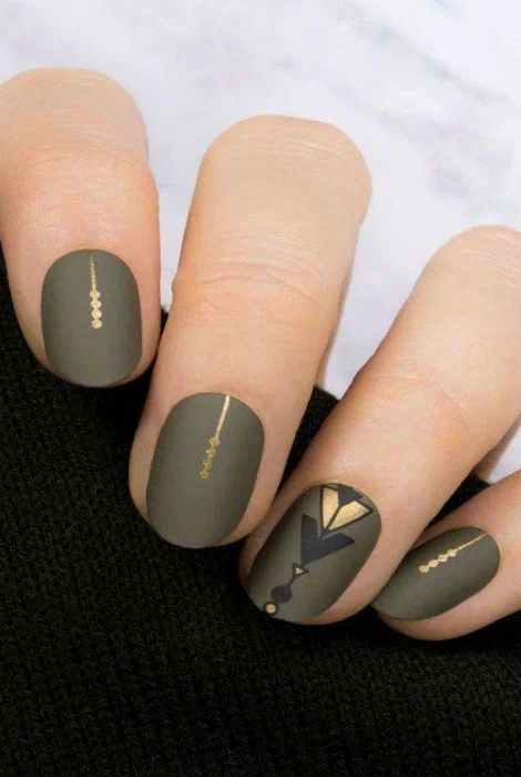 Цього сезону колір хакі на піку своєї популярності. Зверніть увагу на цей глибокий та практичний колір. йдеться не лише про одяг, а й про манікюр. Нанесіть на свої нігтики матовий болотний лак, доповніть золотистими візерунками у геометричному стилі та насолоджуйтесь новим стильним виглядом своїх пальчиків.