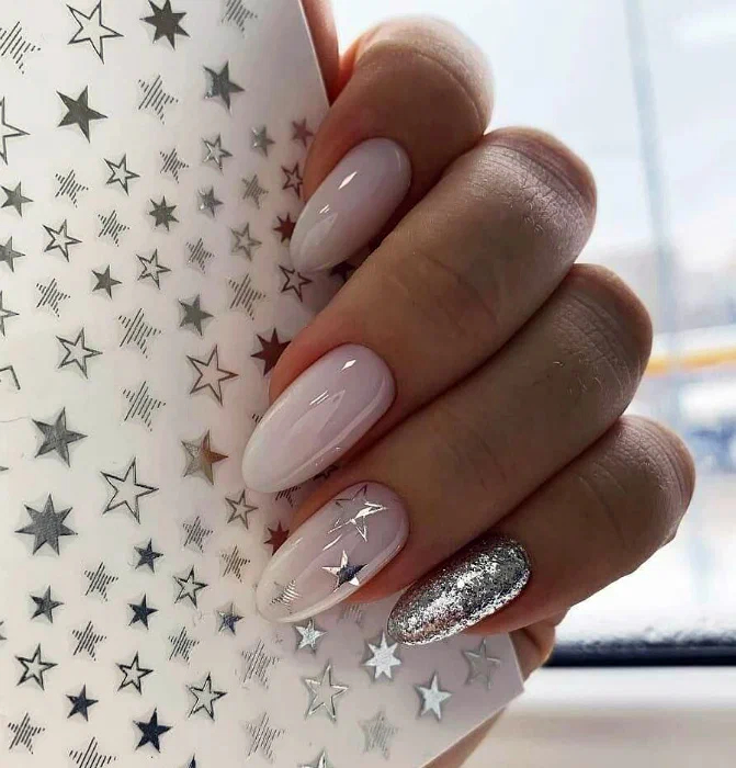 Чудовий манікюр з нігтиками, вкритими напівпрозорим молочним відтінком та окремими пальчиками, прикрашеними сріблястими зірками та блискучою слюдою – чудовий варіант для святкового образу.