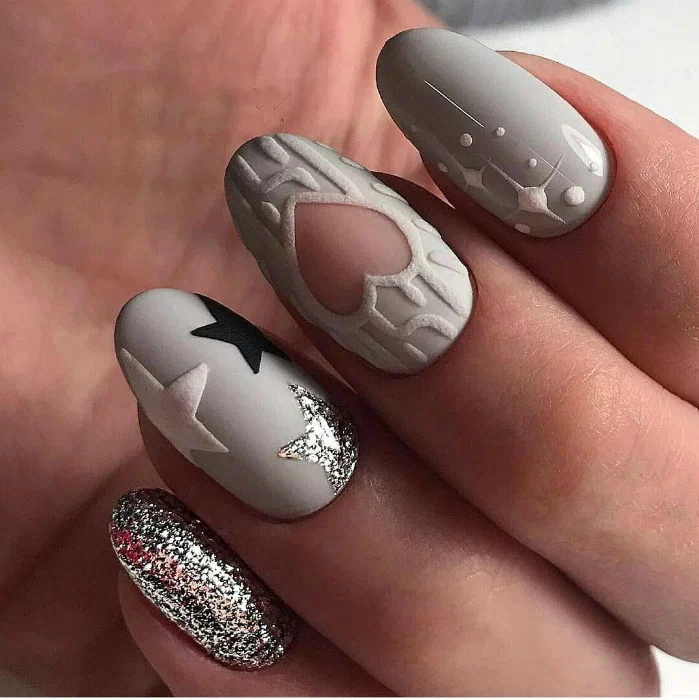 Любителькам оригінального і яскравого манікюру, напевно, сподобається цей варіант з об’ємними візерунками на кшталт в’язки, великими зірками і блискітками.