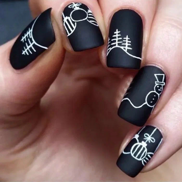 Якщо вам подобаються матові покриття, зверніть увагу на цей манікюр, де на чорному тлі намальовані найпростіші зимові символи: сніговик, ялинки та ялинкові іграшки. Загалом дизайн виглядає як дитячі малюнки на шкільній дошці.