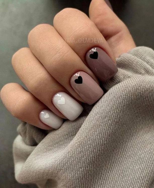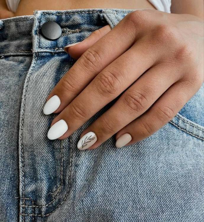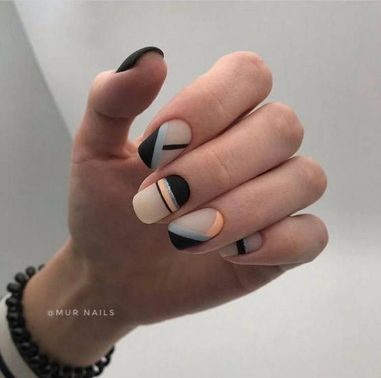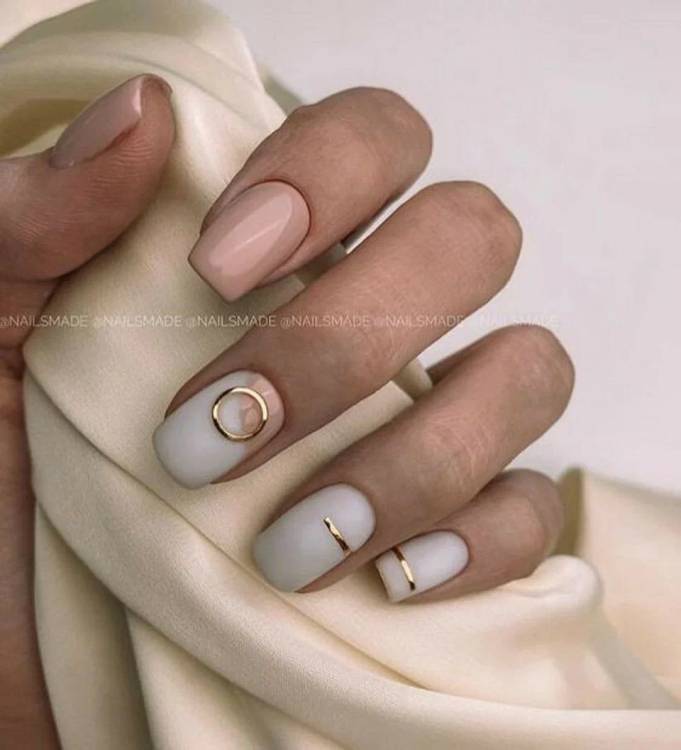 Коротким нігтикам підходить мінімалістичний стиль і ніжна гама. Щоб це не виглядало нудно, виділили акцентом один із них, наприклад, пофарбуй іншим кольором або намалюй геометричні лінії. Для виділення підійде і стильний розсип коштовностей та незвичайна текстура.
