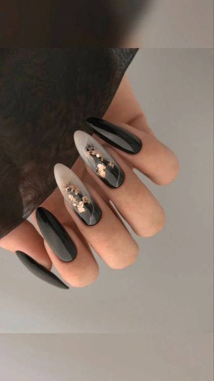 Не виходить із моди чорний колір кожен осінньо-зимовий сезон. Однаково вдало виглядає на коротких та довгих нігтях. Стане гарною базою для візерунків, негативного простору, з фольгою та камінням.