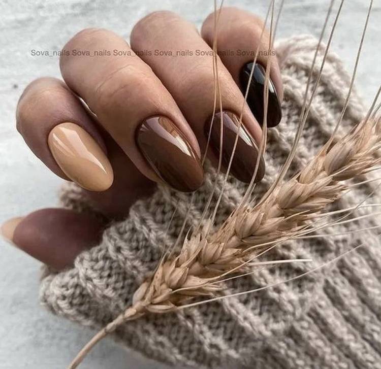 Розкішний шоколадний вишукано виглядає в осінньому образі, особливо на коротких нігтиках квадратної форми.Розбавте його іншими відтінками коричневого і принтами, або прикрась позолотою.