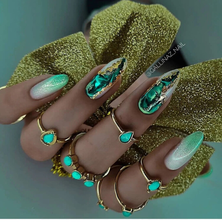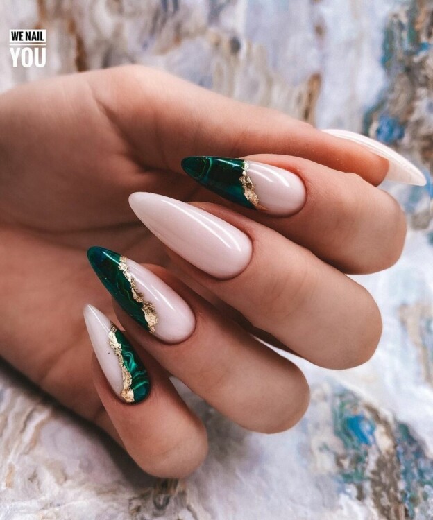 Чудовий варіант, як використовувати смарагдовий колір в дизайні – це розмістити його у вигляді асиметричного френча, доповнивши молочним лаком і золотою фольгою. Красиві текстури, що нагадують малахіт, зроблять нейл-арт ультрасучасним.